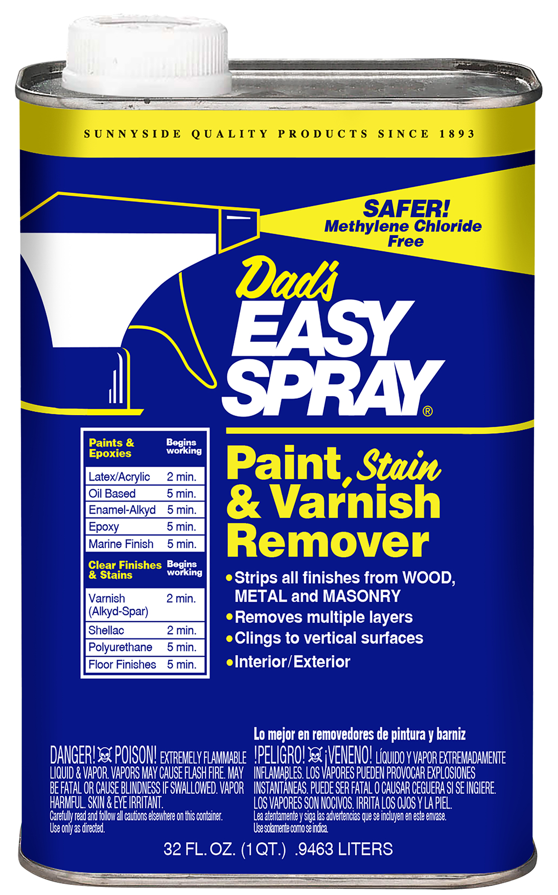 Dad’s Easy Spray stripping gel is designed to remove multiple layers of finish in one application. This Methylene Chloride Free, semi-paste formula clings to rounded and vertical surfaces to make paint removal easy. It quickly attacks the finish and lightens wood stain but will not harm wood or corrode metal. Use on wood, metal and masonry. Effectively removes most latex and oil-based paint, lacquer, shellac, varnish, epoxy and polyurethane finishes.
