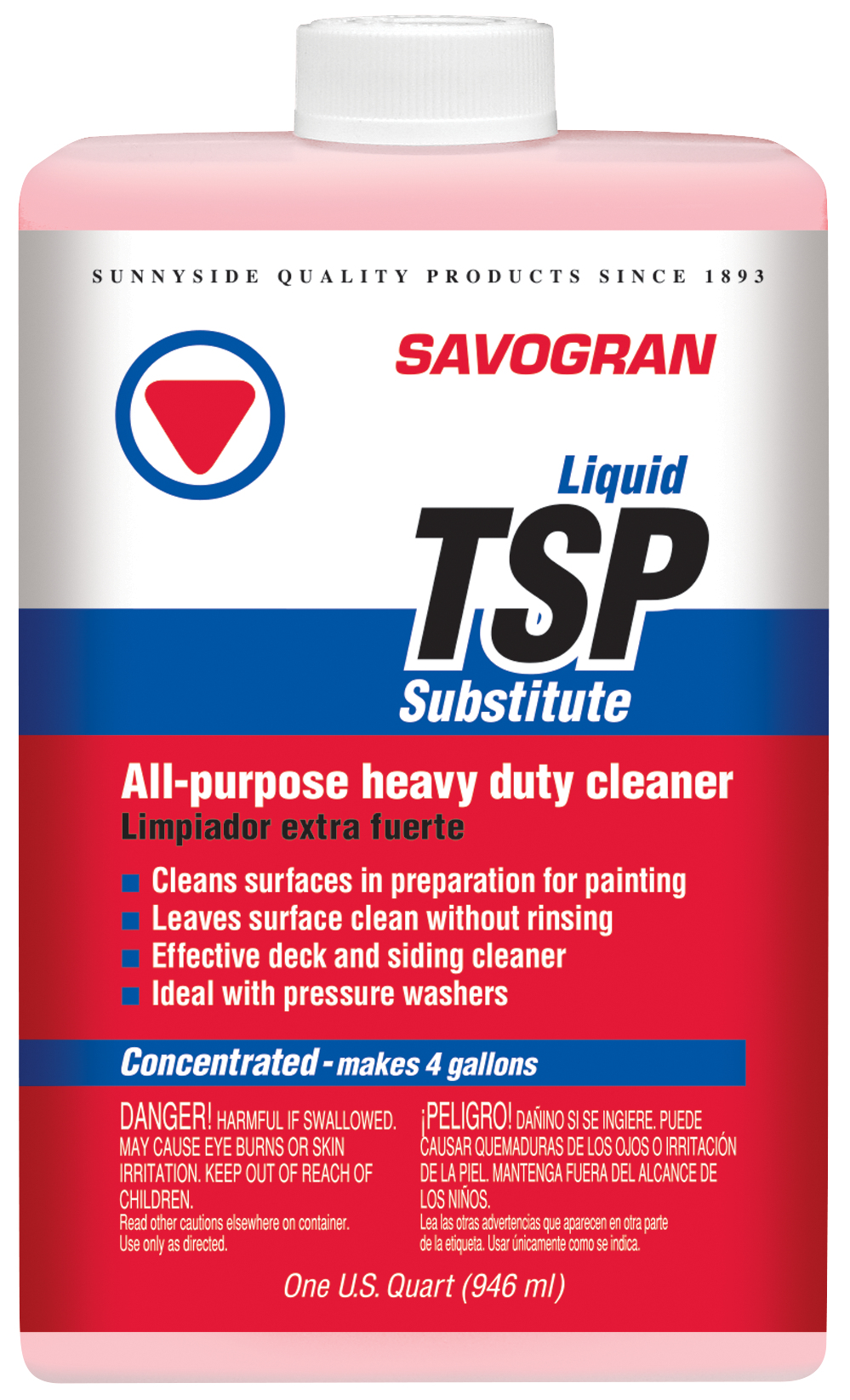 A heavy duty all-purpose cleaner that cuts through heavy deposits of greasy dirt and grime from interior and exterior surfaces. TSP is a concentrated product—one quart of TSP will make up to 4 gallons of cleaning solution. Recommended for cleaning walls, woodwork, ceilings, concrete, metal, vinyl and aluminum siding. TSP phosphate-free cleaner requires no rinsing. Removes mildew stains when mixed with bleach. Apply by hand or with a pressure washer.